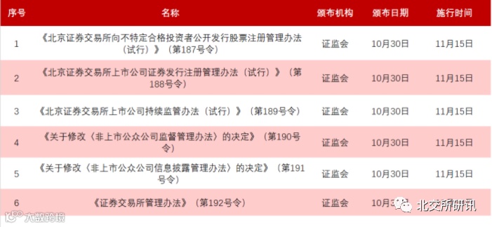 一、北交所基础制度发布完毕 10月30日,证监会发布《北京证券交易所向不特定合格投资者公开发行股票注册管理办法(试行)》、《北京证券交易所上市公司证券发行注册管理办法(试行)》、《北京证券交易所上市公司持续监管办法(试行)》、《关于修改〈非上市公众公司监督管理办法〉的决定》、《关于修改〈非上市公众公司信息披露管理办法〉的决定》、《证券交易所管理办法》,其中《证券交易所管理办法》将于即日起施行,其余5项办法将于11月15日起正式施行。