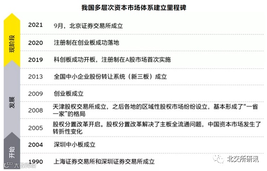 我国资本市场从沪深主板成立开始不断发展,2004年,为解决中小企业融资难以及中国产业转型升级等问题,深交所中小企业板成立;到2009年和2019年,创业板和科创板分别成立,以及新三板(全国中小企业股份转让系统)和区域性股权市场的成立,涵盖主板、科创板、创业板、新三板以及区域性股权市场的多层次资本市场体系基本确立,底层基础设施、监管体系等均逐渐和国际市场接轨。