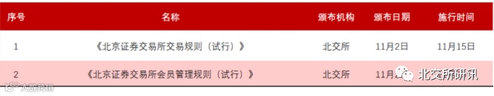 11月2日,北京证券交易所正式发布《北京证券交易所交易规则(试行)》《北京证券交易所会员管理规则(试行)》2件基本业务规则及31件细则指引指南。上述业务规则自2021年11月15日起施行。