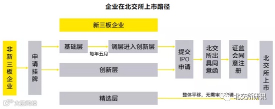 考虑到中小企业股票估值特点,北交所竞价交易涨跌幅限制比列为前收盘价的±30%。根据北交所的设计,北交所将平移精选层挂牌公司,未来上市企业将来自创新层。企业在北交所上市需先进入创新层挂牌,具体上市路径和申请挂牌条件如下: