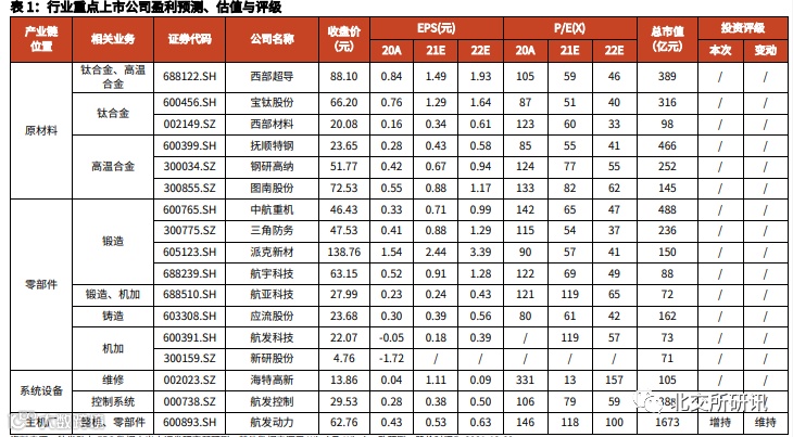 2、借助军民融合推进,成长速度快的零部件供应商以及具有高壁垒的材料供应商,重点关注:抚顺特钢、钢研高纳,图南股份、航亚科技、派克新材、航宇科技、万泽股份等。