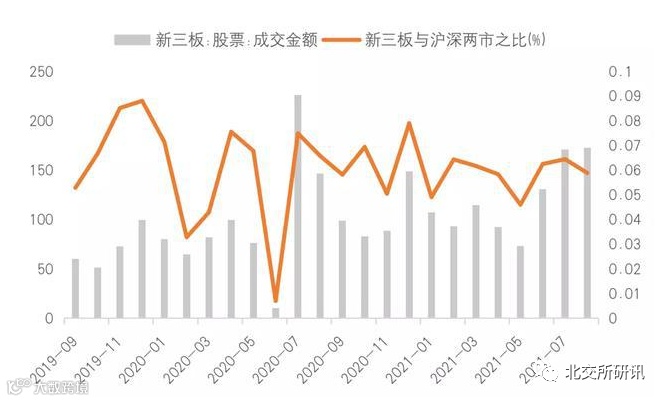 新三板挂牌与其他板相比企业数量最多,但总市值较低,新三板股票成交额仅占沪深两市股票成交额0.1%以下。由于历史因素和定位问题,以前的新三板市场流动性较弱,挂牌企业定价难、