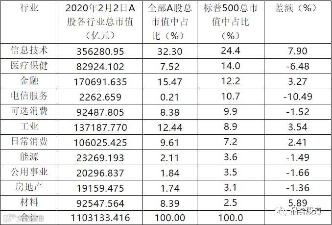 中美股市各行业市值占比对比如下表: