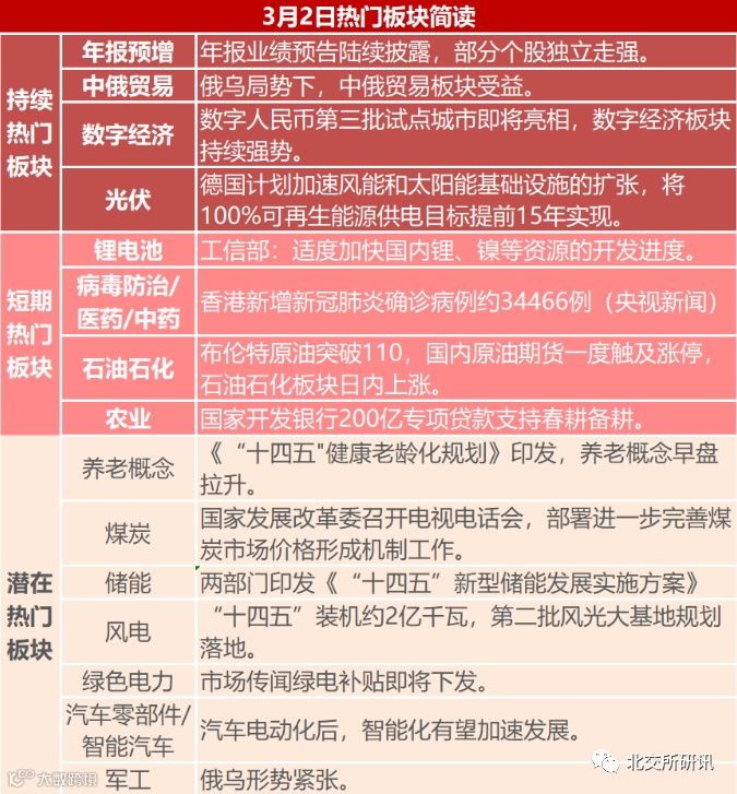 俄乌方面,中俄贸易、油气、农业几个分支领涨。核心驱动还是持续暴涨的能源品和农产品价格,WTI原油期货今天盘中再度大涨6%,一度突破110美元,油价的持续大涨将推升通胀预期,同时也将推升煤炭等替代品的价格,所以近期煤炭板块也持续上涨。另外,海外农产品价格最近也持续上行,美小麦主连期货已经连续两天涨停,除了受俄乌农产品出口影响,也是通胀预期的体现。