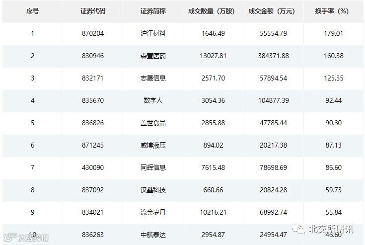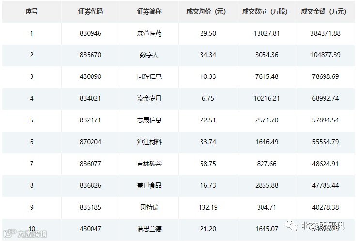 从成交额排名前10个股中,有6只股票成交额超5亿元,其中森萱医药(830946)累计成交38.44亿元,成交均价达29.5元;数字人(835670)累计成交10.49亿元,成交均价34.34元;同辉信息(430090)累计成交7.87亿元,成交均价10.33元。