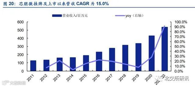 公司主持或参与了家用电器待机功率测量方法、智能家用电器通用 技术要求和智能家用电器系统架构和参考模型等多项家电国家标准的起草制定,获 得了中国半导体行业协会颁发的第六届中国半导体创新产品、2019 年第十四届中国 芯-优秀技术创新产品奖等多项行业荣誉和奖项。芯朋微为第 3 批入选专精特新的企业,于 2019 年 6 月 4 日摘牌新三板(新三板股票代码:430512),挂牌新三板 8 年期间(2011-2019 年)营收 CAGR 达 13.5%,归母净利润 CAGR 达 23.6%,转板上市科创板,于 2020 年 7 月 22 日上市,挂牌新三板及转板上市以 来(2011-2020)营收 CAGR 达 15.0%,归母净利润达 26.4%。