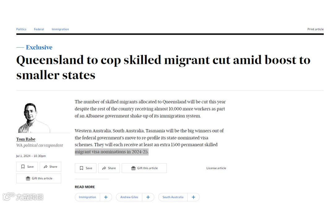 在本财年,昆士兰成为唯一一个配额下降的州,这种变化可能与昆士兰州长史蒂文·迈尔斯支持联邦反对党领袖彼得·达顿早些时候提出的削减移民以缓解住房压力的建议有关。