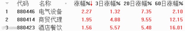 行业板块方面,涨幅前三分别是电气设备、商贸代理、酒店餐饮,跌幅前三分别是文教休闲、家居用品、医疗保健。
