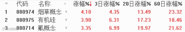 概念板块方面,涨幅前三分别是烟草概念、有机硅、氟概念,跌幅前三分别是基因概念、C2M概念、维生素。
