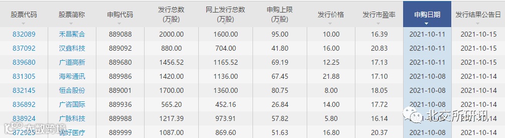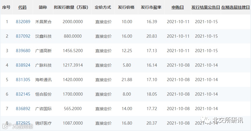 9月2日宣布设立北京证券交易所以来的首轮精选层打新10月8日正式启动,总共5只新股开放申购,分别是锦好医疗、广咨国际、恒合股份、海希通讯和广脉科技,定价方式全部是直接定价,发行市盈率最低16.14倍,最高20.37倍。