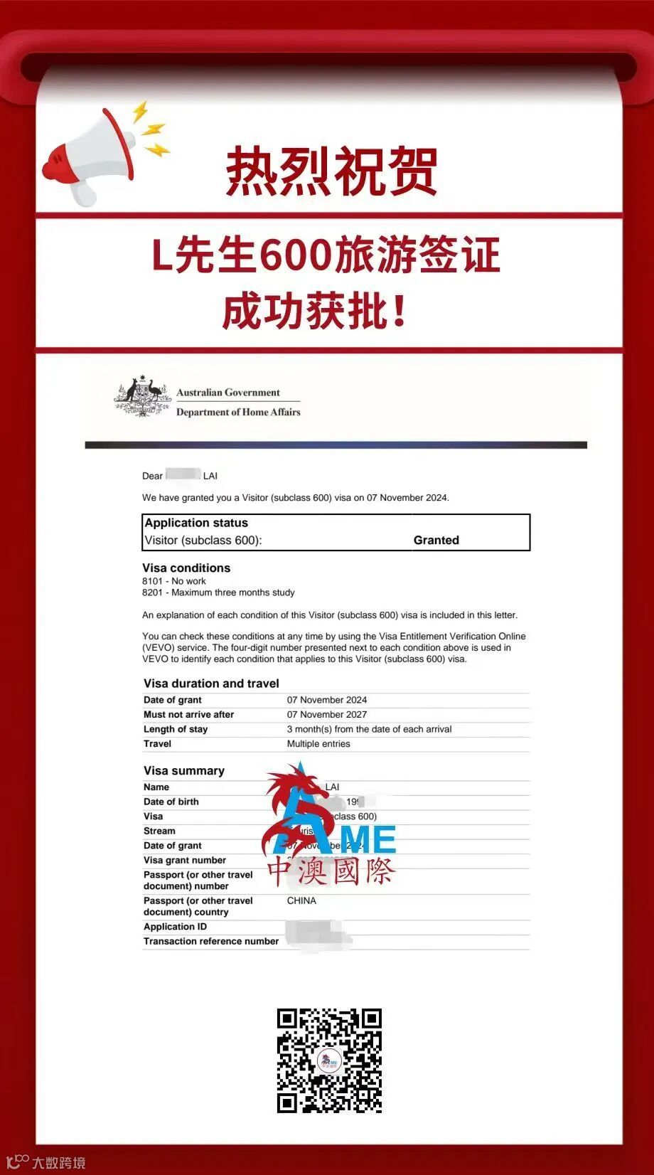 600旅游签近期部分成功案例: