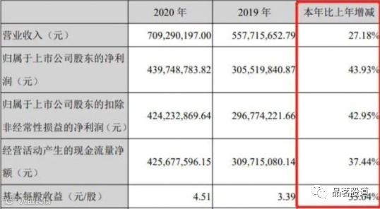 根据爱美客2020年报,公司营业收入约为7.09亿元,同比增长27.18%,归属于上市公司股东的净利润约为4.40亿元,同比增长43.93%。营业收入、净利润、扣非净利润、现金流和每股收益均获得不同程度增长。