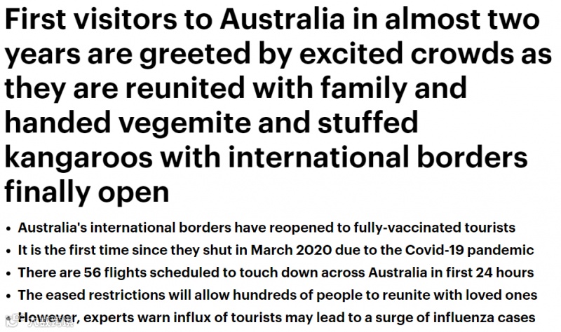 《每日邮报》2月21日报道,在因新冠疫情而关闭国境近两年后,澳洲国境于今日重新开放,首批国际航班飞抵澳洲。
