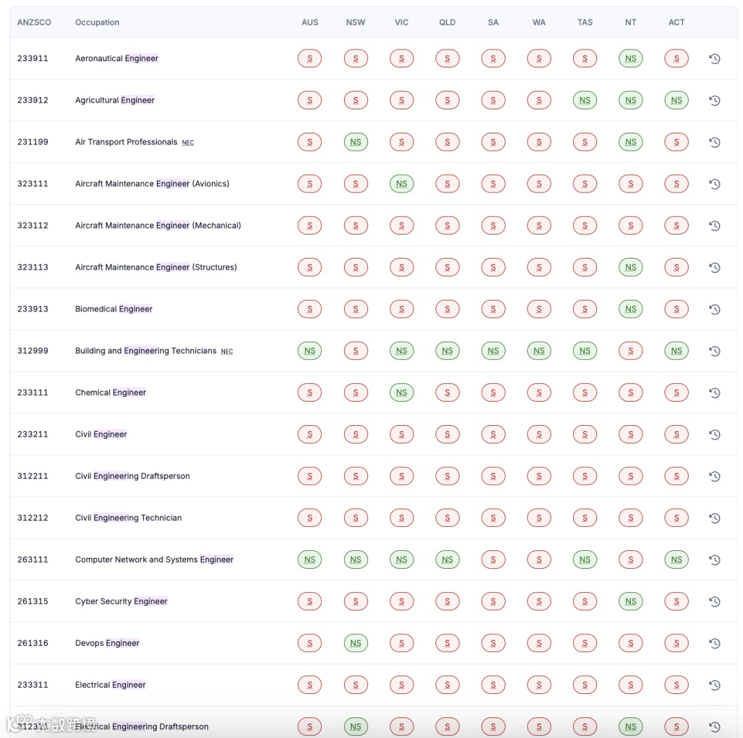 以下是澳洲各类工程师在各州的稀缺情况,可以看到大部分职业都是S的Shortage状态!尤其土木类是全澳都缺人!