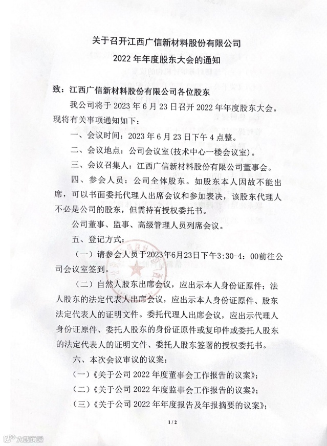 导读:江西广信新材料股份有限公司将于2023年6月23日召开2022年度股东大会,现将本次股东大会事宜公告如下