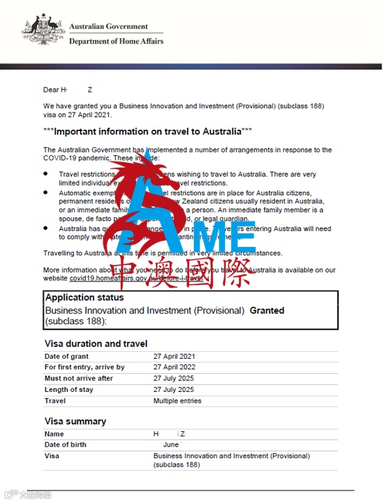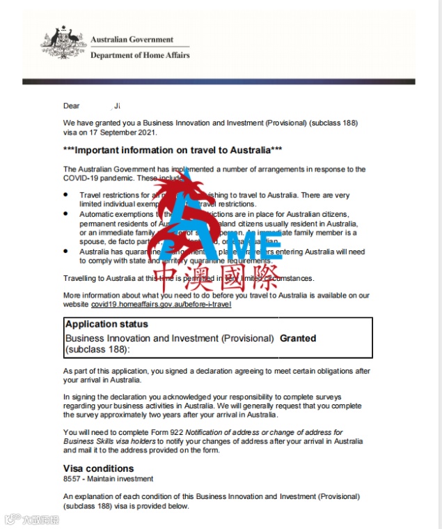 蒋女士全家 重大投资者188签证