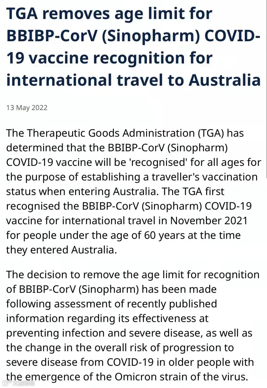 澳洲治疗药品管理局(TGA)5月13日发表声明称,取消针对国药疫苗(BBIBP-CorV Sinopharm)的年龄接种限制。