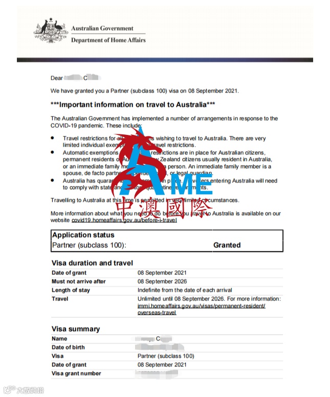 在2020年10月14日递交了100签证申请后,终于在2021年9月8日C女士的签证顺利获批!