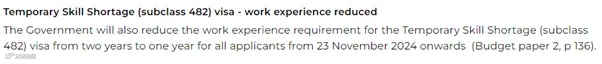 最值得庆祝的是,作为澳洲移民配额里面最大份额的雇主担保移民,要求又降低了,并且是历史上最低的要求。从 2024 年 11 月 23 日起,482雇主担保临签的工作经验要求,将从两年缩短至一年。在此之后递交的申请,将按照新要求审理。