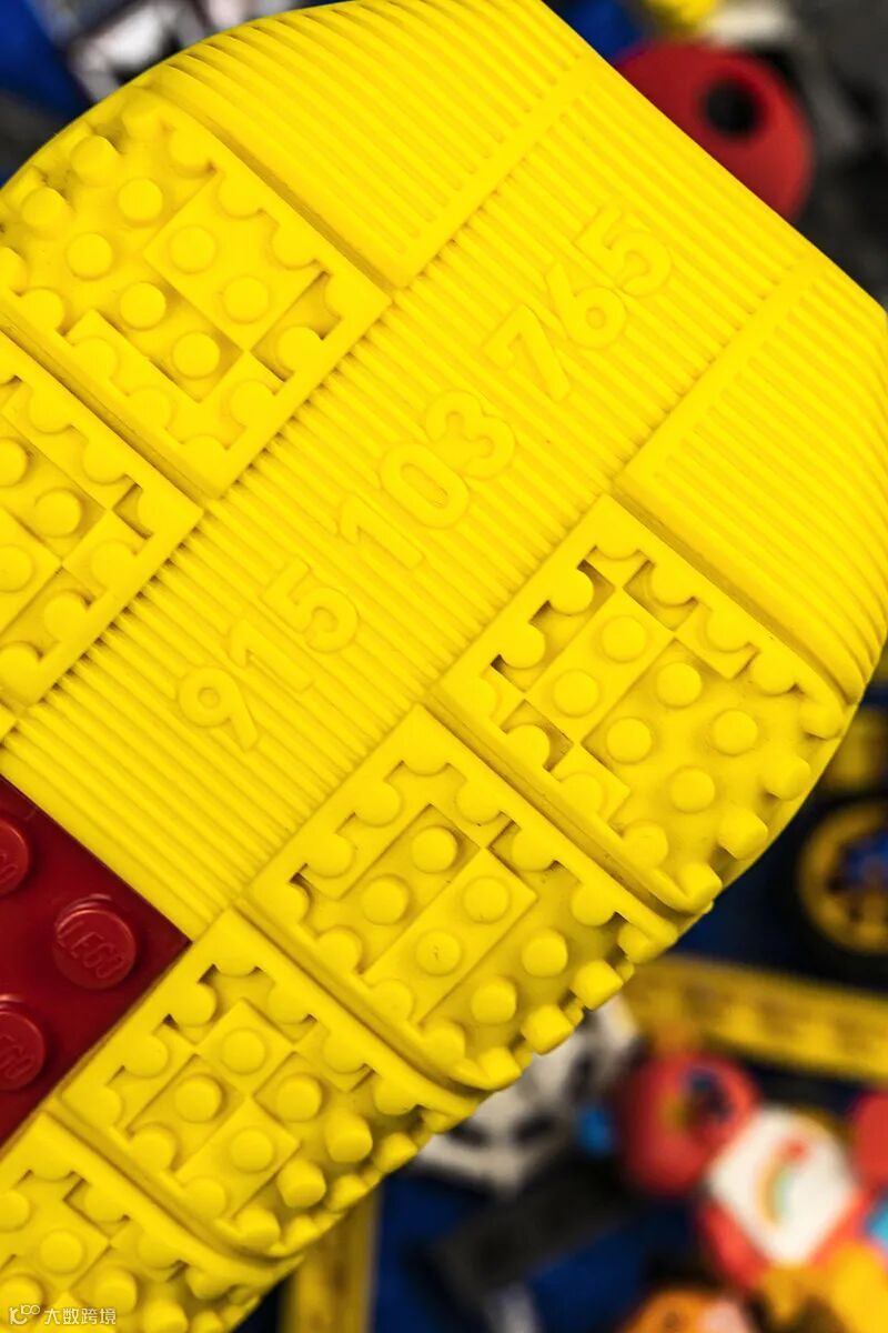 联名的最大亮点是乐高积木的钉形经典设计,作为鞋跟,鞋带扣和鞋底的关键装饰,强调了经典玩具的独特设计特色。