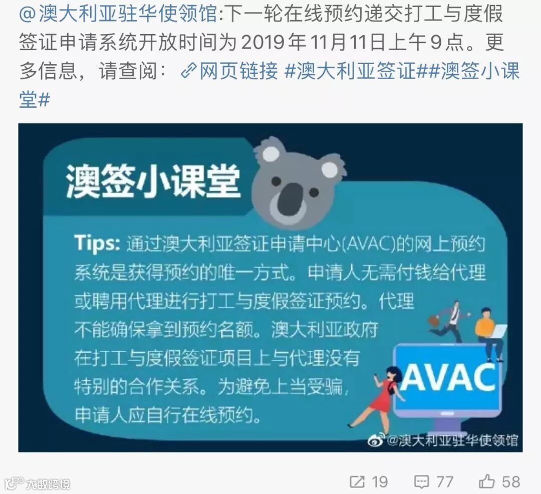 澳大利亚驻华使领馆微博发布消息:2019-20年度第二批WHV名额将于11月11日上午9点开放(北京时间),提醒大家注意是北京时间哦~