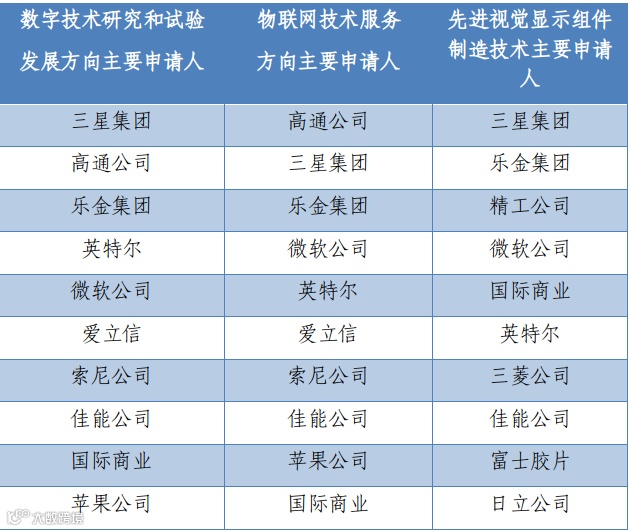 从热点技术方向TOP10重要申请人分布看,在数字技术研究和试验发展技术方向,美国企业有4家,中国和韩国企业各2家,日本和瑞典企业各1家。在物联网技术服务技术方向,美国企业有4家,中国和韩国企业各2家,日本和瑞典企业各1家。在先进视觉显示组件制造技术技术方向,美国和日本企业有3家,中国和韩国企业各2家。我国上榜企业有华为、腾讯、京东方,已经在全球数字经济领域崭露头角。