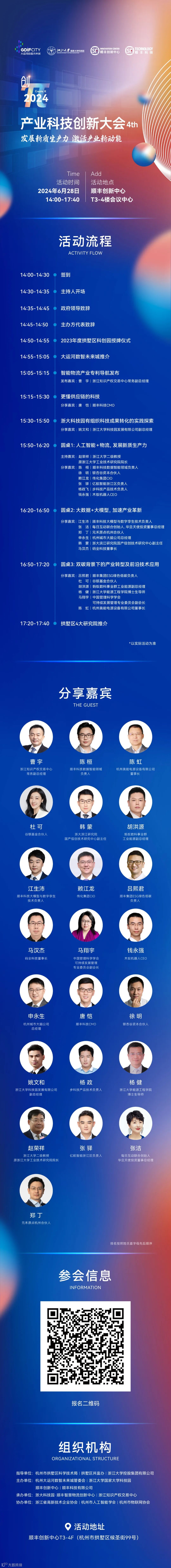 本次大会由杭州市拱墅区科学技术局、拱墅区共富办、浙江大学控股集团有限公司指导,杭州大运河数智未来城管委会、浙江大学国家大学科技园、顺丰科技有限公司、顺丰创新中心共同主办,浙江知识产权交易中心承办。