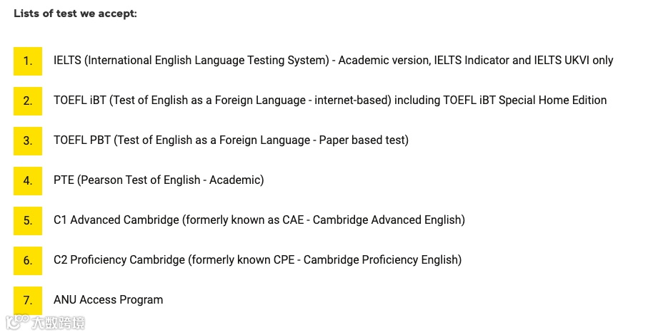 澳洲国立大学(ANU)多数课程的最低雅思要求为总分6.5,单项成绩6.0。但临床心理学(Clinical Psychology)和职业心理学(Professional Psychology)两门硕士课程的雅思要求为总分7.0,单项成绩7.0。
