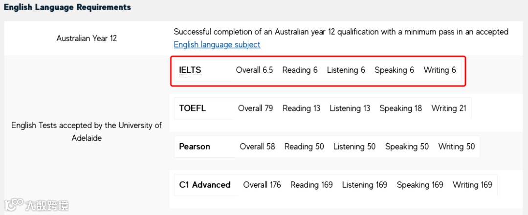 阿德莱德大学硕士课程标准雅思水平为总分6.5,各单项成绩不低于6.0,但也会有部分课程标准高于6.5。