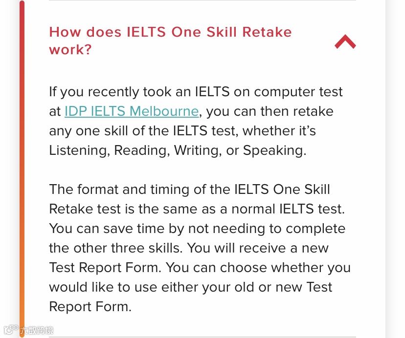 前提条件:你已经在澳大利亚的指定考试中心(目前已知的指定地点是墨尔本IDP考试中心)考过一次雅思全科(A、G类都适用)了,但是你对某科成绩不满意,希望重考。