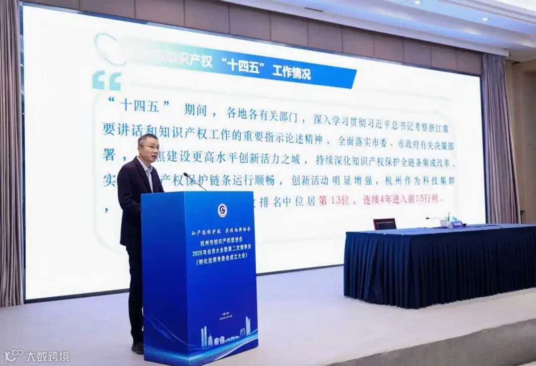 12月19日下午,杭州市知识产权促进会2025年会员大会暨第二次理事会在滨江区顺利召开。杭州市市场监督管理局党委委员、副局长林霄出席讲话,杭州市人民检察院副检察长、杭州市政协常委、杭州市知识分子联谊会会长徐剑锋作主旨演讲。杭州高新区(滨江)市场监管局党委书记、局长姜黎出席并致辞,杭州市市场监督管理局知识产权发展促进处处长、杭州市知识产权促进会会长沈建国,杭州市知识产权保护中心主任、杭州市知识产权促进会副会长陈兆波等领导参加。