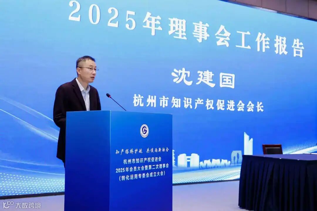 沈建国会长向大会作2025年理事会工作报告和财务报告,获大会一致审议通过,并代表主管部门,详细介绍了杭州市“十四五”知识产权工作成就和“十五五”知识产权工作规划。