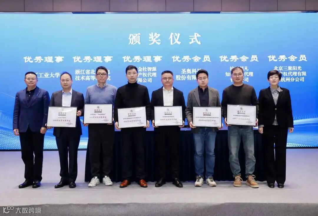 浙江金杜智源知识产权代理有限公司、浙江省北大信息技术高等研究院和浙江工业大学荣获2025年优秀理事单位,圣奥科技股份有限公司、杭州超凡知识产权代理有限公司和北京三聚阳光知识产权代理有限公司杭州分公司荣获2025年优秀会员单位,姜黎局长和陈兆波主任分别为上述单位颁发证书。