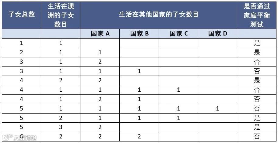 申请人至少有一半以上的子女长久居住在澳大利亚 或者 申请人的子女居住在澳大利亚的比居住在其他国家的要多。注意:家庭平衡测试中所涉及的子女包括子女、继子女、养子女等。