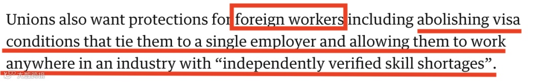 工会希望为外国工人提供保护,包括取消将他们与单一雇主联系在一起的签证条件,并允许他们在“经过独立核实的技能短缺”的行业的任何地方工作!