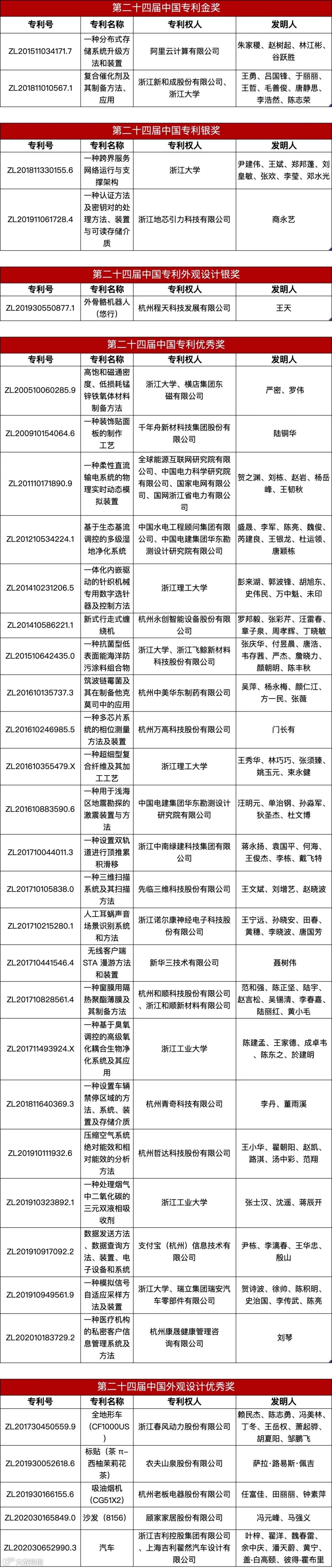 此外,浙江大学参与的“复合催化剂及其制备方法、应用”获得中国专利金奖;浙江大学的“一种跨界服务网络运行与支撑架构”和浙江地芯引力科技有限公司的“一种认证方法及密钥对的处理方法、装置与可读存储介质”获得中国专利银奖;杭州程天科技发展有限公司的“外骨骼机器人(悠行) ”获得中国外观设计银奖。千年舟新材科技集团股份有限公司的“一种装饰贴面板的制作工艺”等23项获得中国专利优秀奖,浙江春风动力股份有限公司的“全地形车(CF1000US)”等5项获得中国外观设计优秀奖。杭州市市场监管局(知识产权局)获得优秀组织奖。