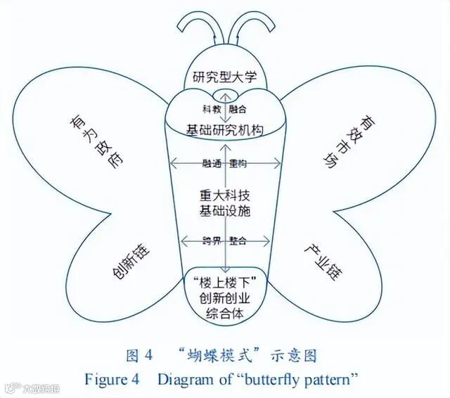 以新型研究型大学为“蝶头”、以基础研究机构为“蝶胸”,聚焦“0—1”的原创突破,科教融合引领高质量科技人才与产业人才的培养;以重大科技基础设施和“楼上楼下”创新创业综合体为“蝶腹”,融通重构创新要素,助力“1—10”的产业转化,增强科技成果转化、孵化链条的韧性;以“有为政府”和“有效市场”为左右“蝶翅”,跨界整合创新创业,驱动“10—∞”的能级跃升,强化未来产业发展的核心竞争力。