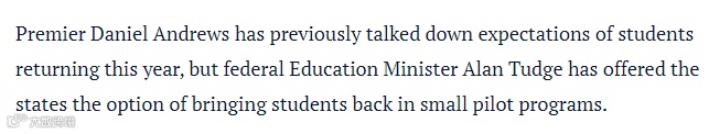 前不久教育部长演讲表明支持各州提出学生返澳计划以及进行小规模试点。小薇只希望澳洲政府让留学生返澳的进程可以加快,不要让大家失望。
