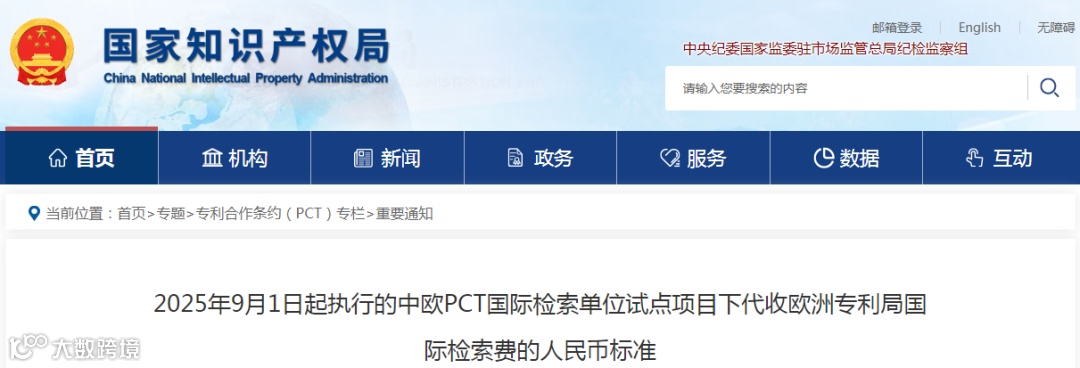 根据《关于中欧PCT国际检索单位试点项目以人民币代收欧洲专利局国际检索费的通知》,国家知识产权局自2025年9月1日起执行的中欧PCT国际检索单位试点项目下代收欧洲专利局国际检索费的人民币标准发生变化,现将相关事项通知如下。
