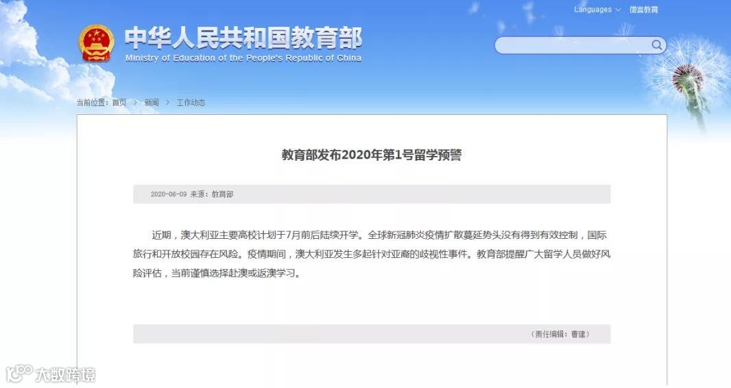 教育部今日发布2020年第1号留学预警。