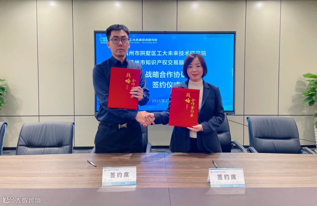 杭州市知识产权交易服务中心总经理助理雷昱与杭州市拱墅区工大未来技术研究院副院长陈微微代表双方共同签署知识产权战略合作协议。