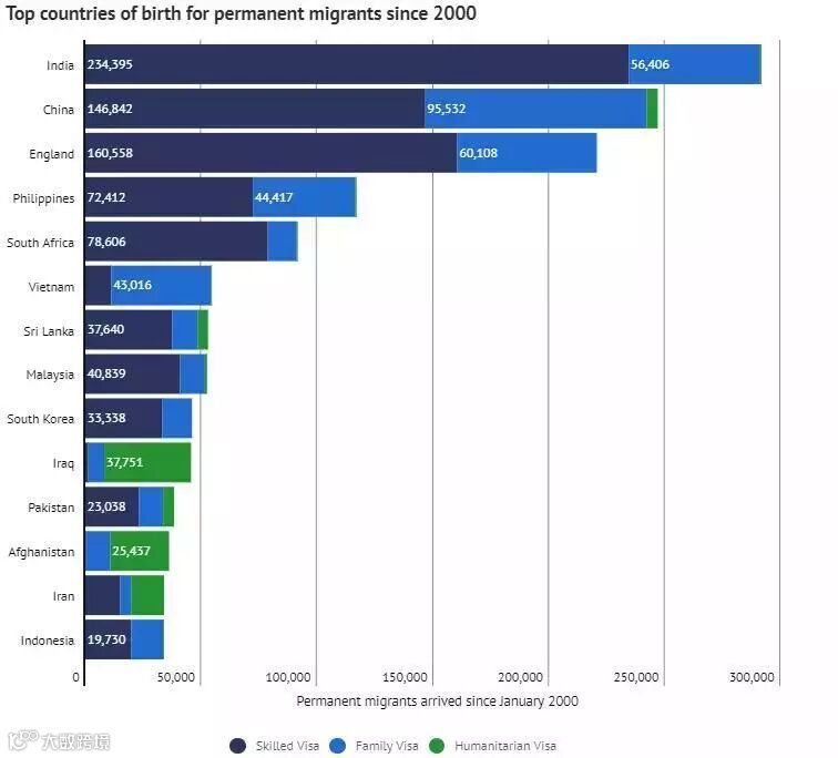 澳洲移民从主要来自欧洲国家,转变为来自亚洲国家。