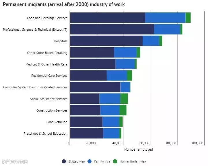 2000年后来澳永居移民从事行业情况。(澳洲统计局)
