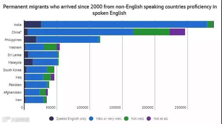 2000年后来澳的非英语国家永居移民中,英语达到熟练程度的人数比例。(数据来源:澳洲统计局)