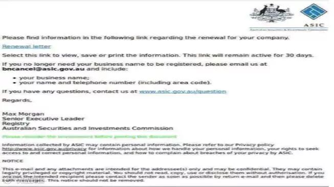此前曾有公司经营者收到了来自ASIC(澳大利亚投资证券委员会)的“官方”邮件,要求补充经营资料。邮件里包含了两个链接,第一个通往ASIC官网,而另一个才是钓鱼网站。