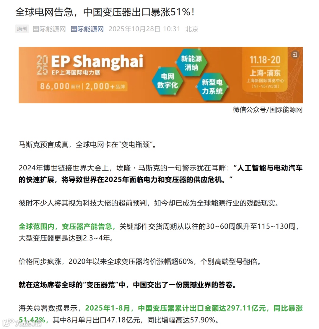 全球范围内,变压器产能告急,关键部件交货周期从以往的30~60周飙升至115~130周。