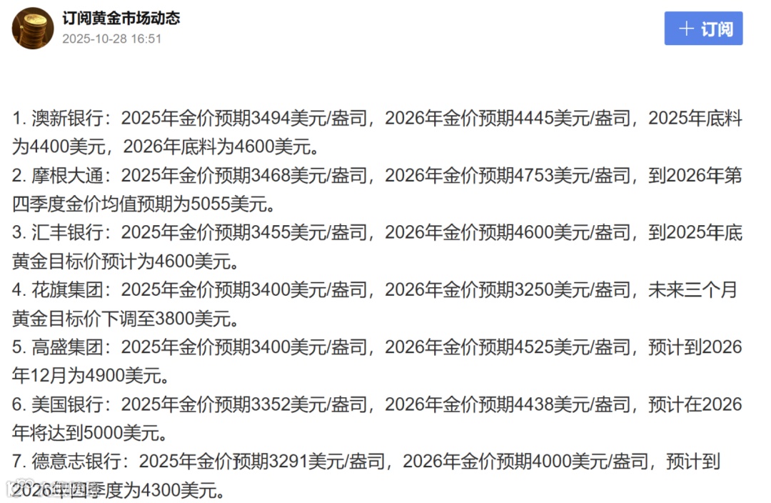 5、知名投行今明两年金价预期汇总