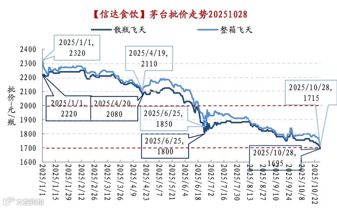 2025年10月28日,53度500ml飞天茅台散瓶批发参考价报1690元,较前一日下跌25元,首次跌破1700元/瓶大关,再创上市以来的新低。