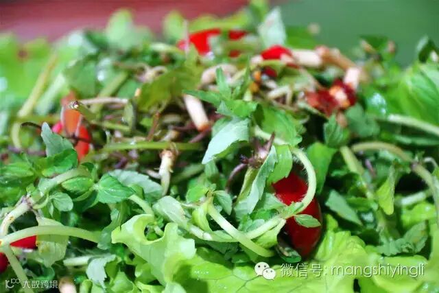 景颇拌菜,原料以生菜为主,将可生食的野生绿色植物或蔬菜采摘后洗净晾干,拌入景颇豆豉、小酸茄、小米辣等佐料,根据不同的菜蔬揉拌入味,鲜辣爽口。