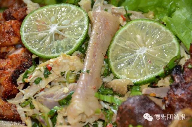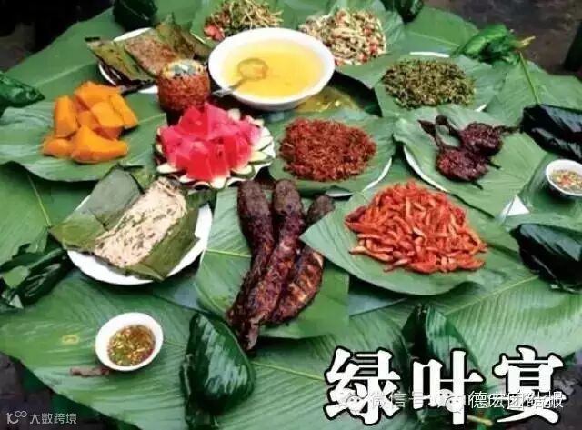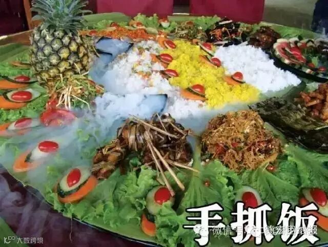 手抓饭不仅是德宏少数民族景颇族餐饮文化的代表作,也是人们“回归自然、绿色环保”餐饮理念的最好见证。手抓饭最早演变自景颇族的绿叶宴,是景颇族为了庆祝丰收的喜庆宴,大家围坐一起,以绿叶当碗,以手做筷,除了有“团圆、和谐、欢乐”等美好的寓意之外,吃手抓饭的过程别有一番味道。